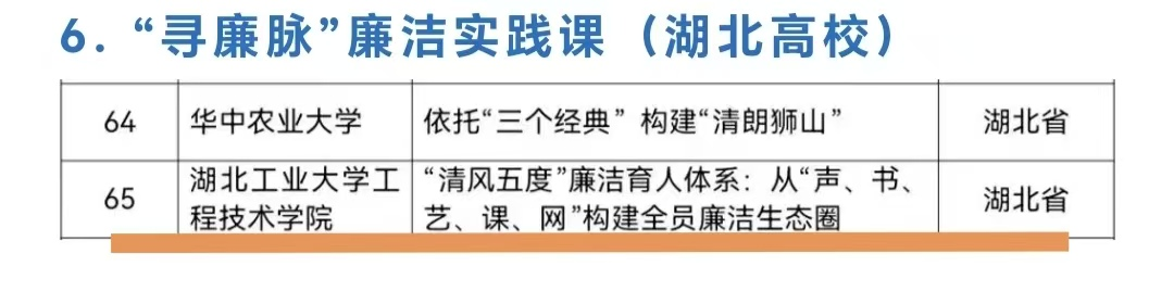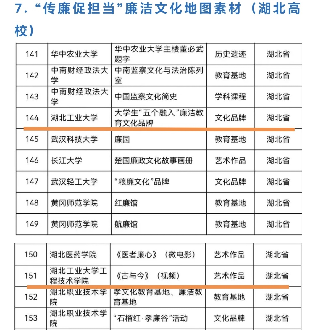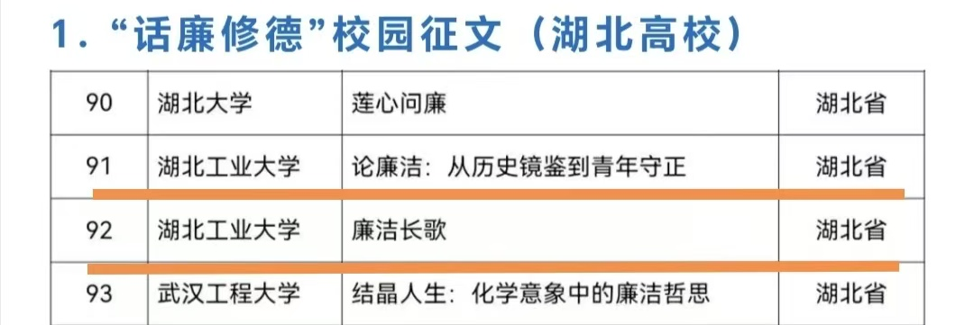 近日,教育部公布第十届高校廉洁教育系列活动评选结果,湖北省共有34项作品获奖,我校土木建筑与环境学院、艺术设计学院、经济与管理学院、工程技术学院共5件作品入选,入选数量创历史新高,位列湖北省属高校第一。